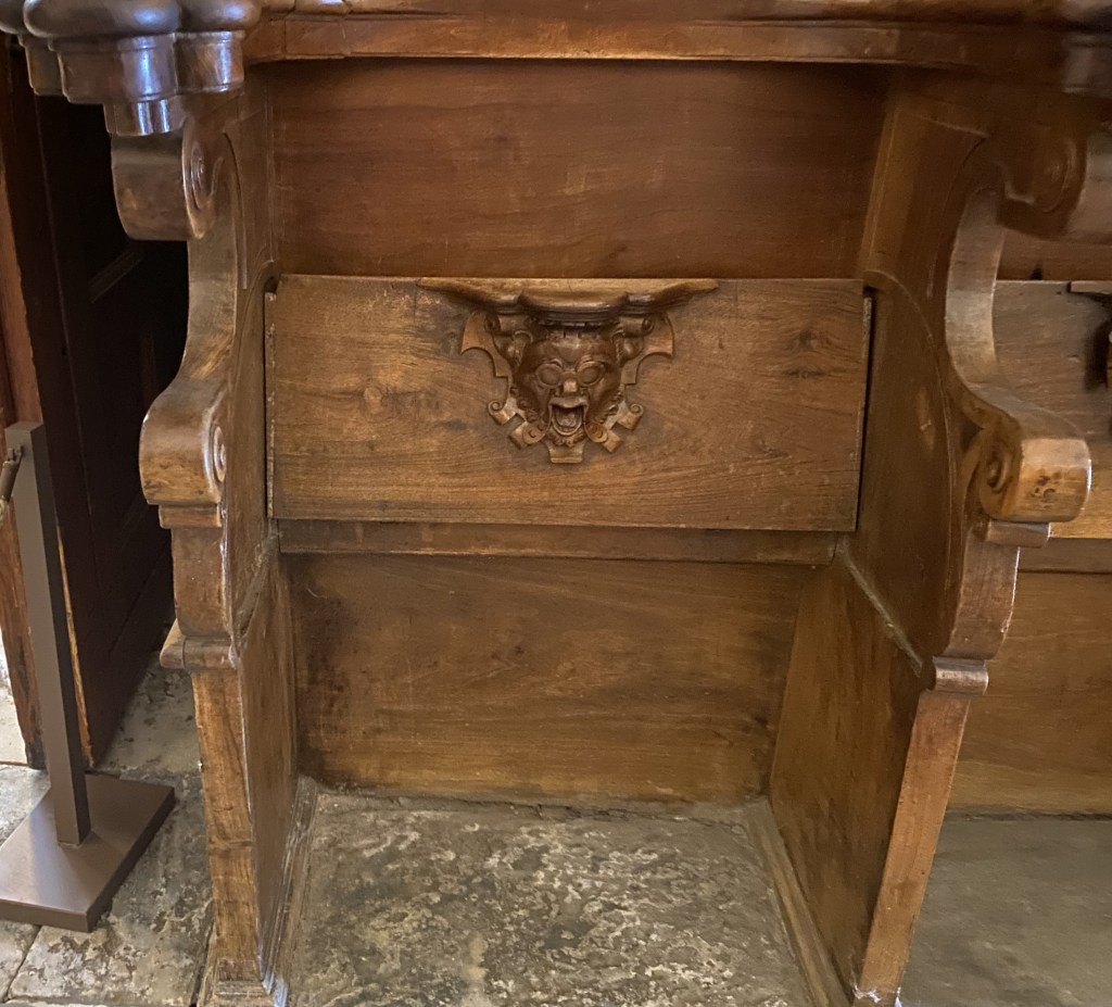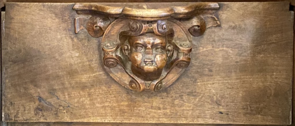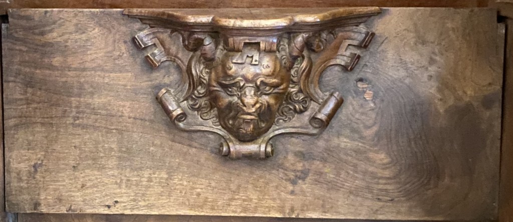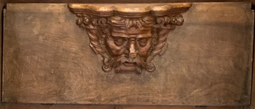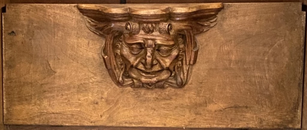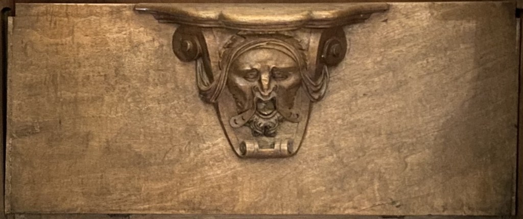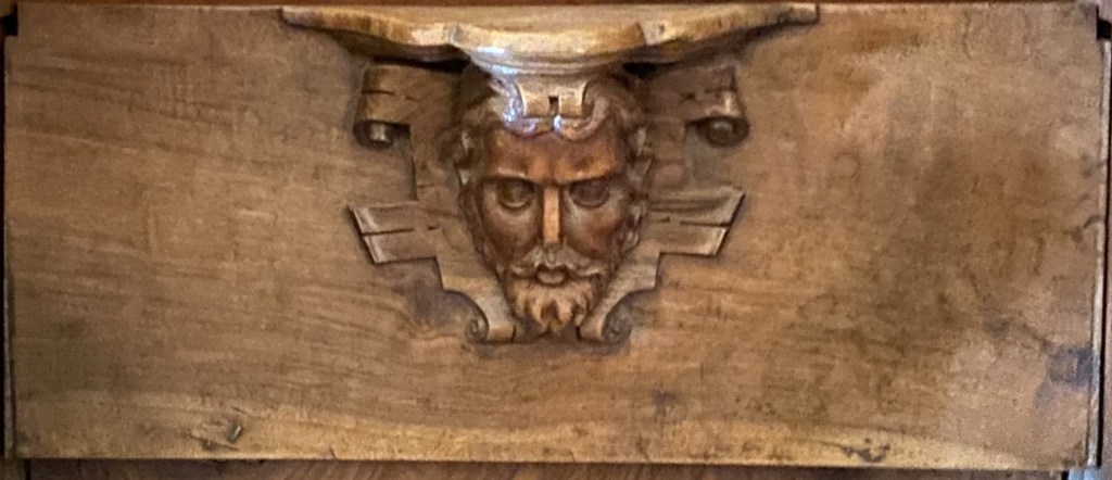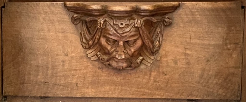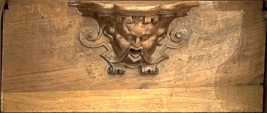 So were these guys? Portraiture rarely exists in a vacuum so one can conjecture that they are people known to the creators of the misericords. Of the 56 faces, half a dozen (E1, E5, E9, E14, W15 and W17) can be described as caricatures or fantastics. But the rest are fairly straight-forward portraits. Combine this with the practice of artists of including themselves when the opportunity arises and one can speculate that it is the woodcarver himself who is shown in image E14 sticking his tongue out at us.
