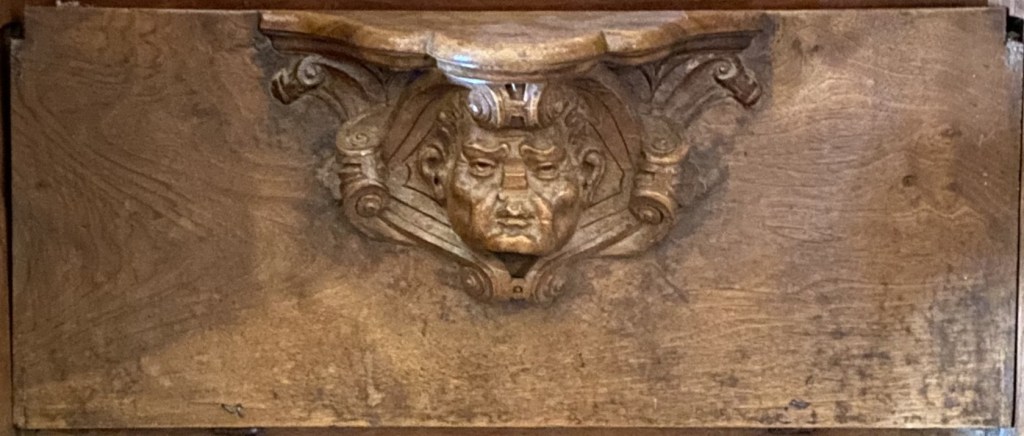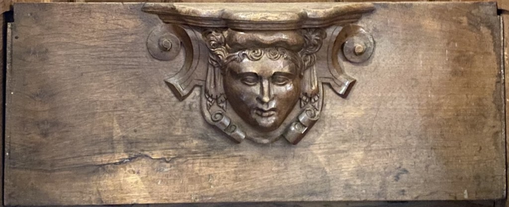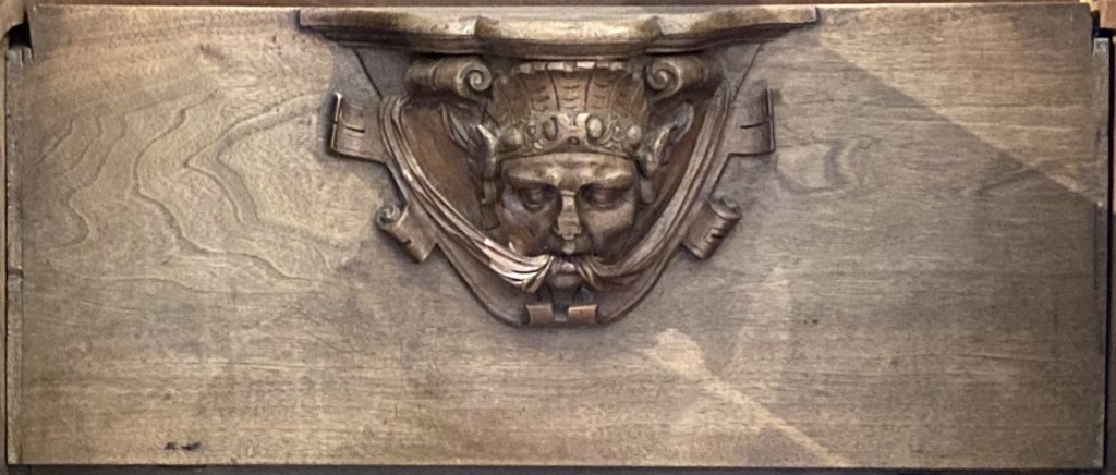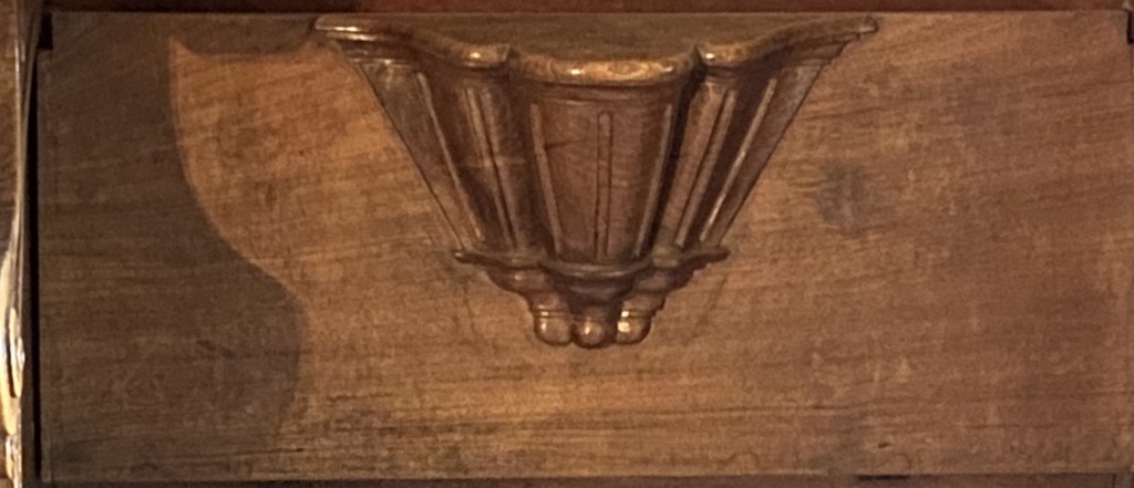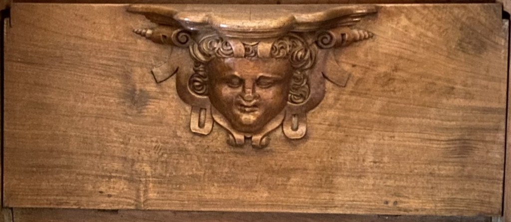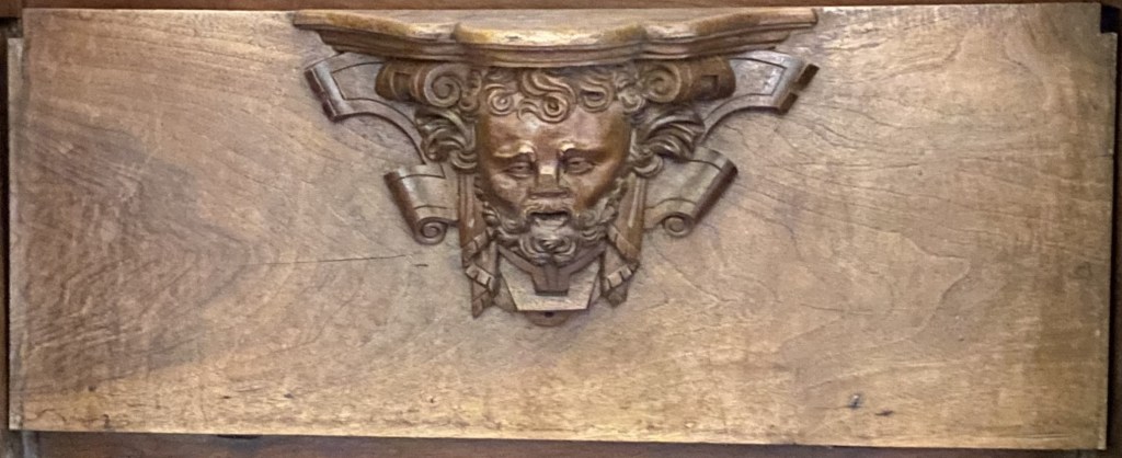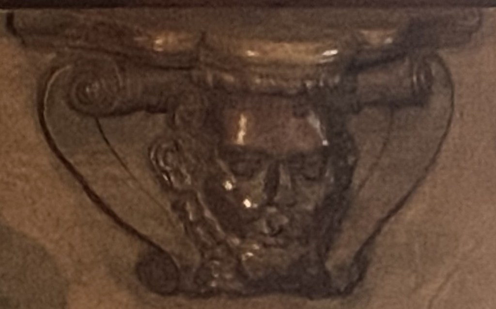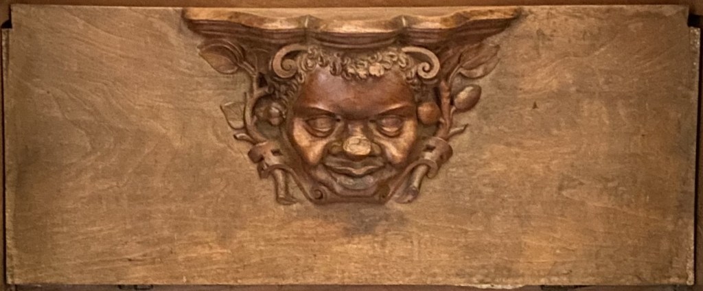 The carving’s background is ribbons above and scrolls below.