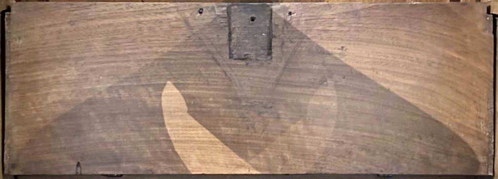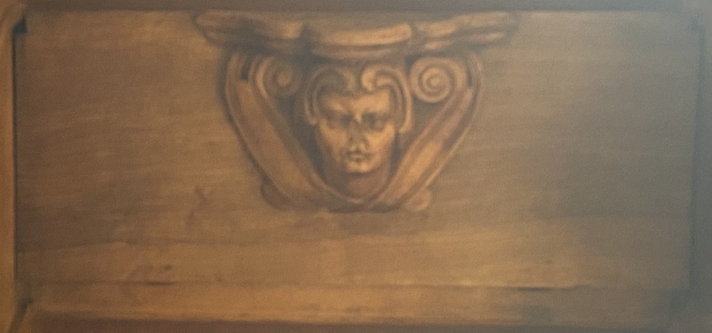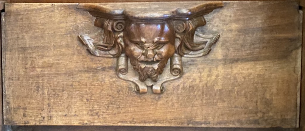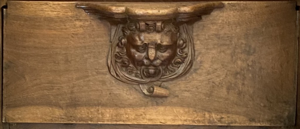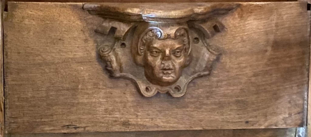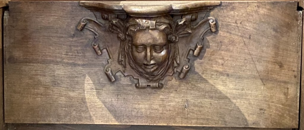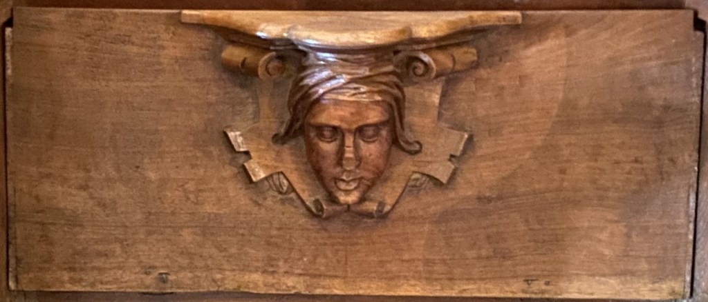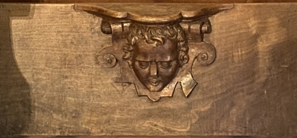 The carving’s background is ribbons above and scrolls below.