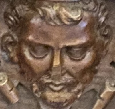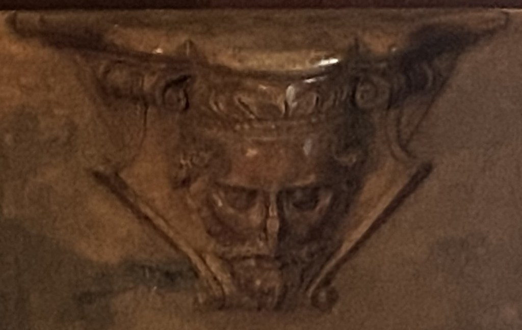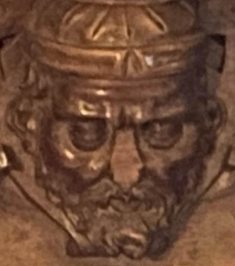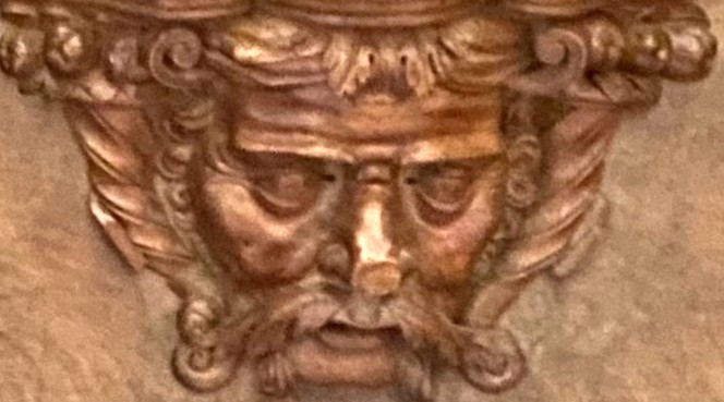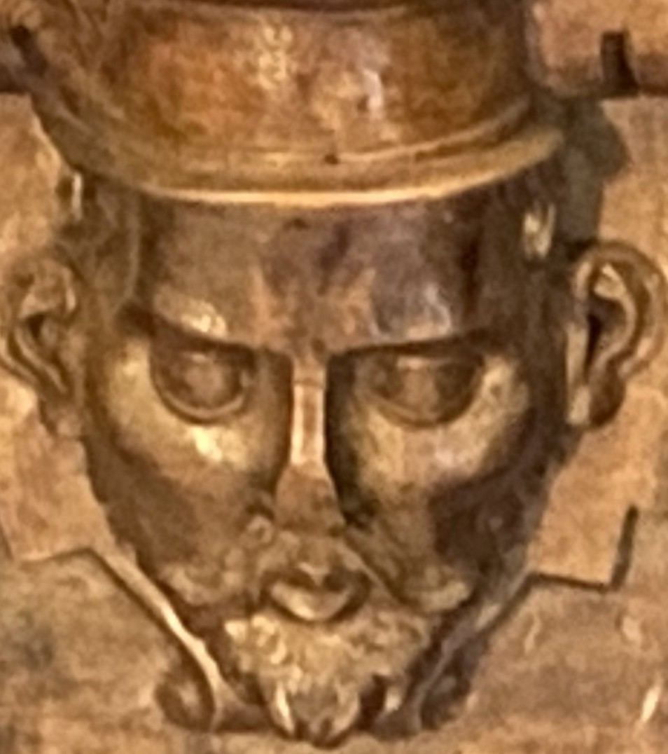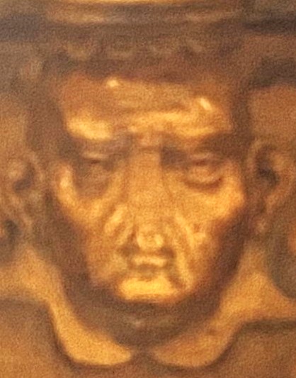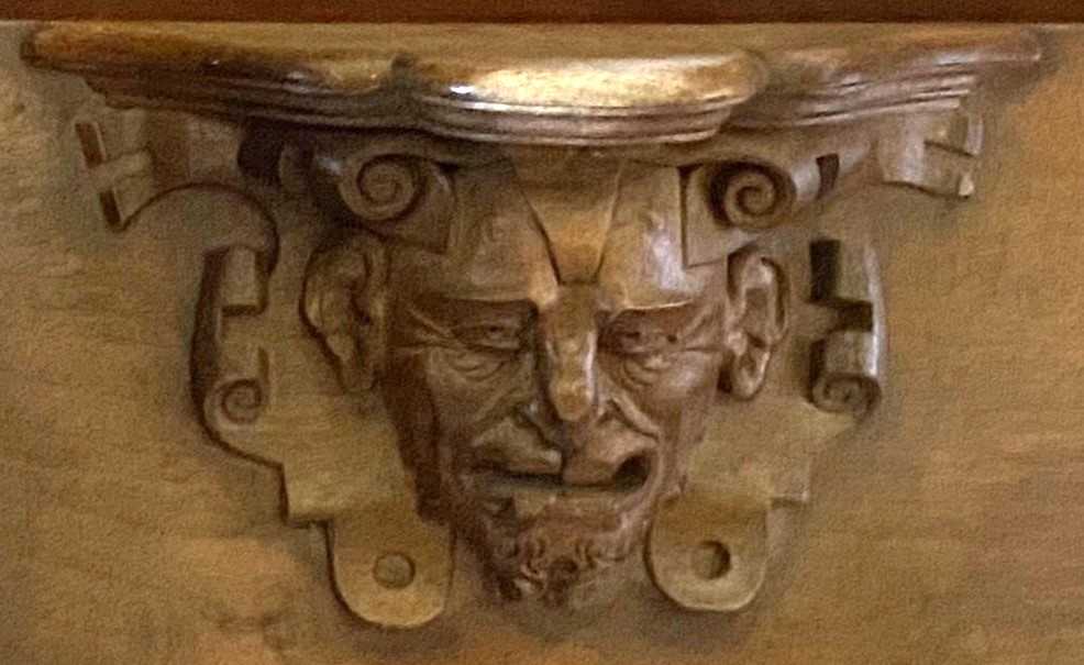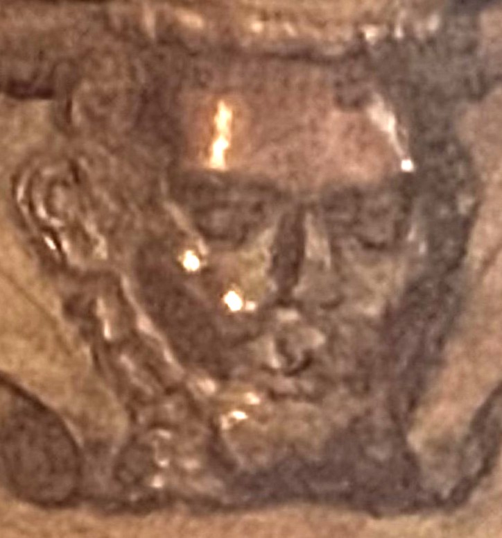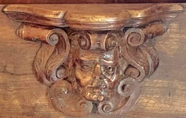 The background is scrolls. The woodwork has suffered damage to the subject’s nose.