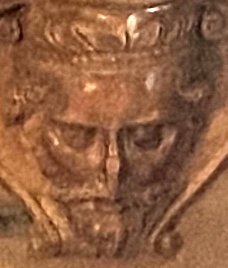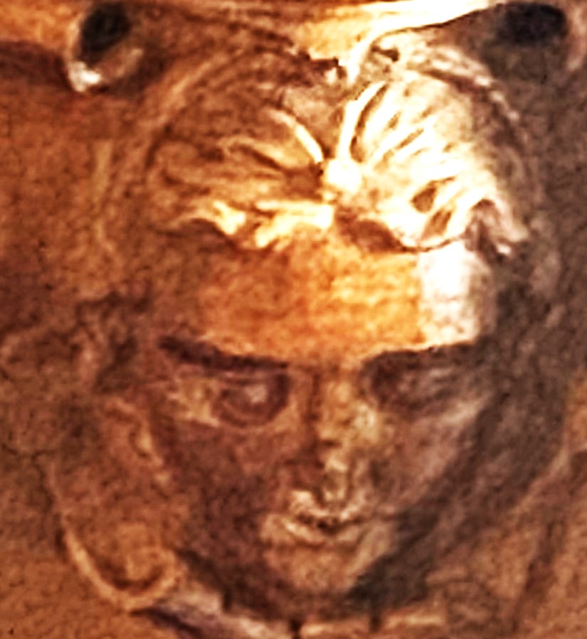The woodwork has suffered damage to the subject’s nose.