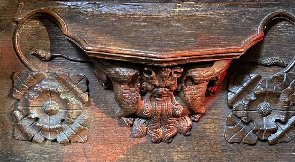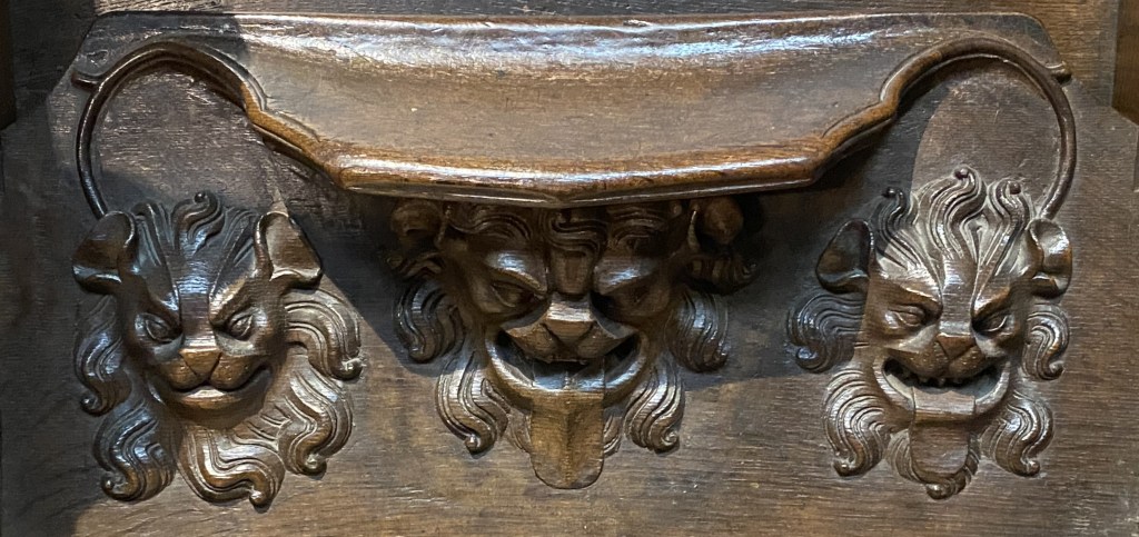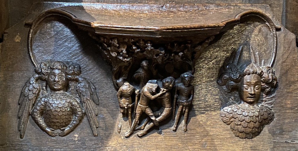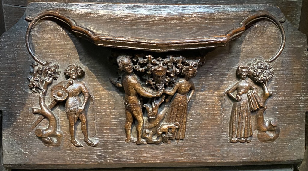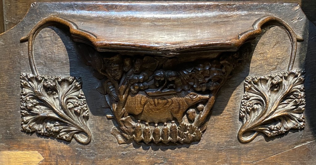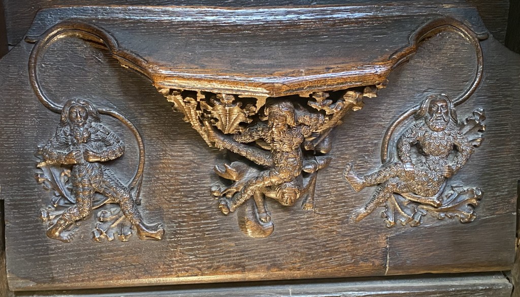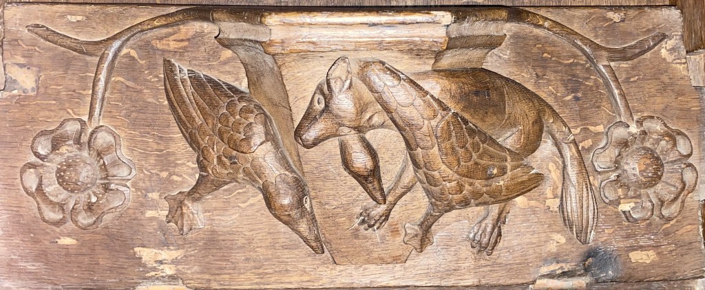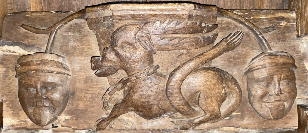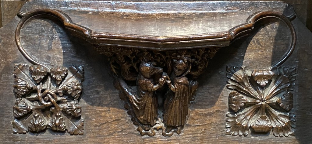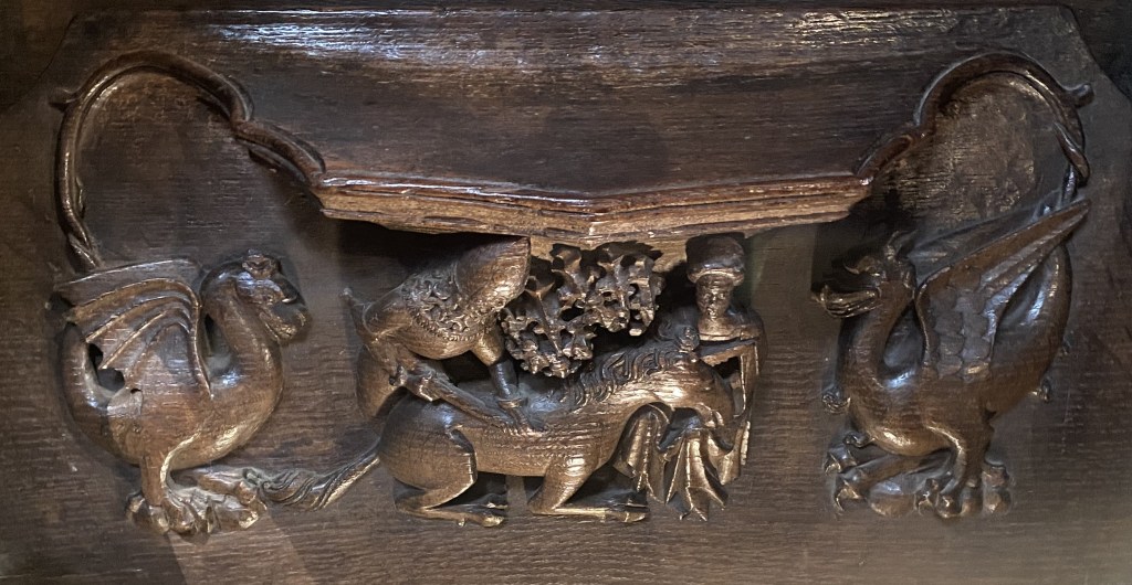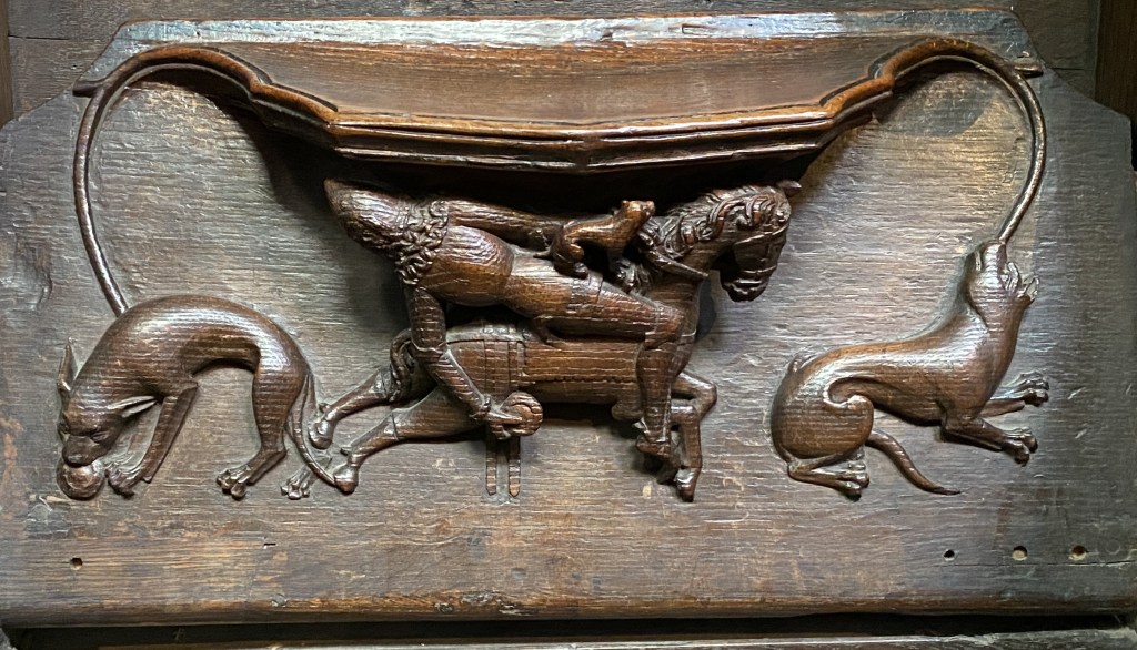 The stalls were restored in the 19th century by Sir George Gilbert Scott and several new bench ends replaced carvings which were considered unsuitably bawdy; Fox and Grapes, Fox and Crow, and Fox and Stork from Aesop’s Fables were carved by Robert Bridgeman (1845 to 1918). In 1919 George Faulkner Armitage (1848-1937) carved a further misericord on north side, St George and the Dragon with inscription ‘League of Nations to the Rescue’.