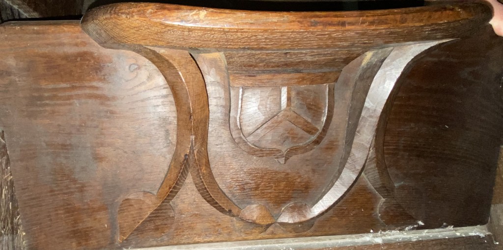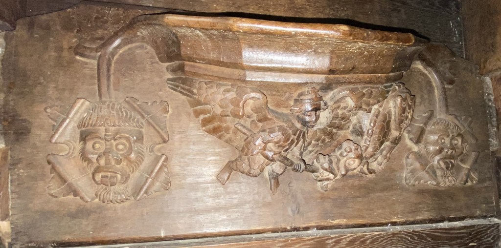 St Andrew’s Church’s panelled oak choir stalls have ten misericords in the back row of each side. I use the same numbering as misericords.co.uk