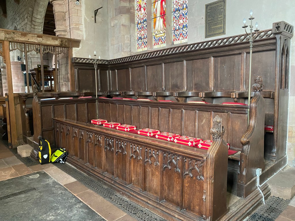 Great Malvern Priory, Worcestershire has thirty-six stalls of which all but two have carved misericords. Twenty-two are medieval and they are much wider than the twelve nineteenth-century stalls which were added to the east-end of each row in Victorian times. The medieval stalls were moved around the building in the centuries following the dissolution of the monastery in 1539 and their original order is unknown.
