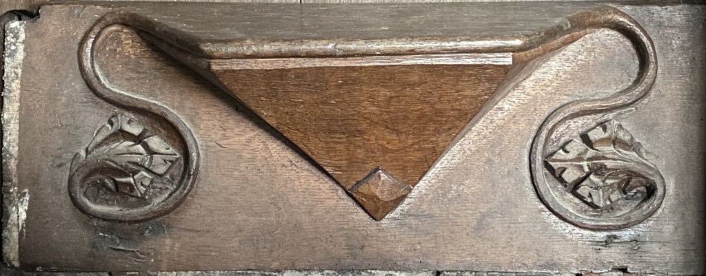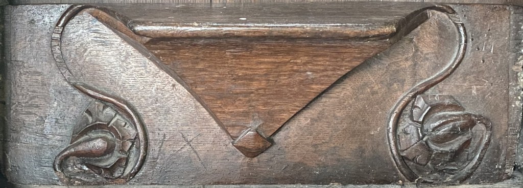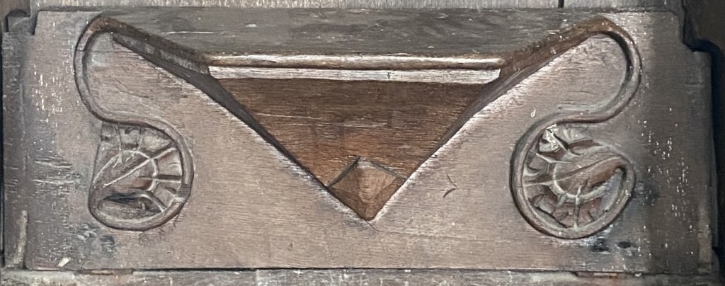 The misericords are all in the same style; a striking central shelf of simple, elegant design. Most of them are connected to supporters consisting of various formulations of oak leaves or sunflowers. N3, S2 and S6 lack the supporters but there are traces of them on S2 and S6 which suggests that all twelve may have had both features. Might the loss of the supporters suggests that they were separately created from the seats?