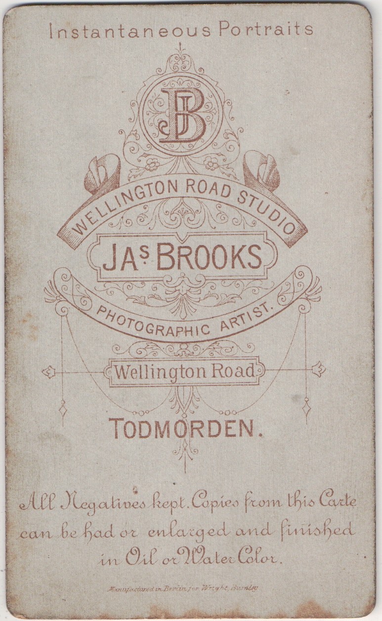 - Jas Brooks Wellington Road Studio, Todmorden. Instantaneous Portraits. Photographic Artist. All negatives kept. Copies from this Carte can be had or enlarged and finished in Oil or Water Color. Manufactured in Berlin for Wright, Burnley