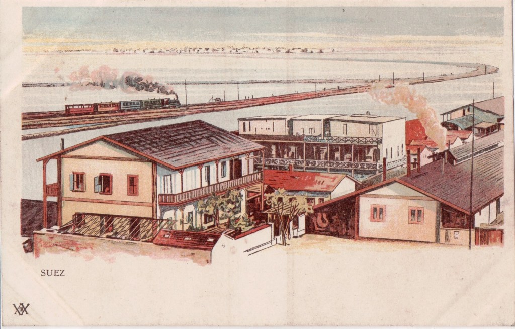 This is one of a series of drawings of Suez in Egypt. The number between the Xs is different in my other card from this publisher, indicating that it is a card number.