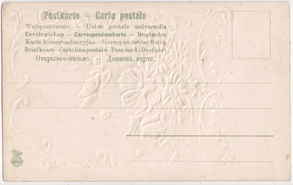 This publisher, probably German, published decorative embossed cards bearing a logo of a bird with a letter in its beak surmounting a globe. As David Schofield observes in pc logos, the words “trade mark” on the logo suggest that this is a firm which traded internationally