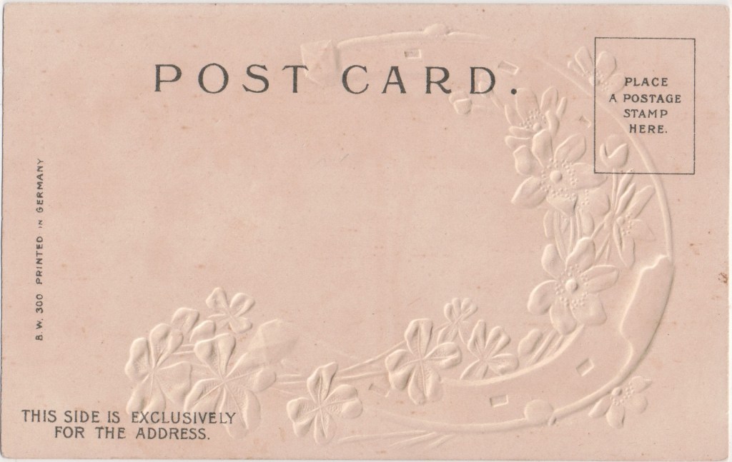 Published embossed undivided-back greeting cards and comic cards in the divided-back era. Early cards had an elaborate floral display under the words POST CARD centred around a monogram of the letters PB.